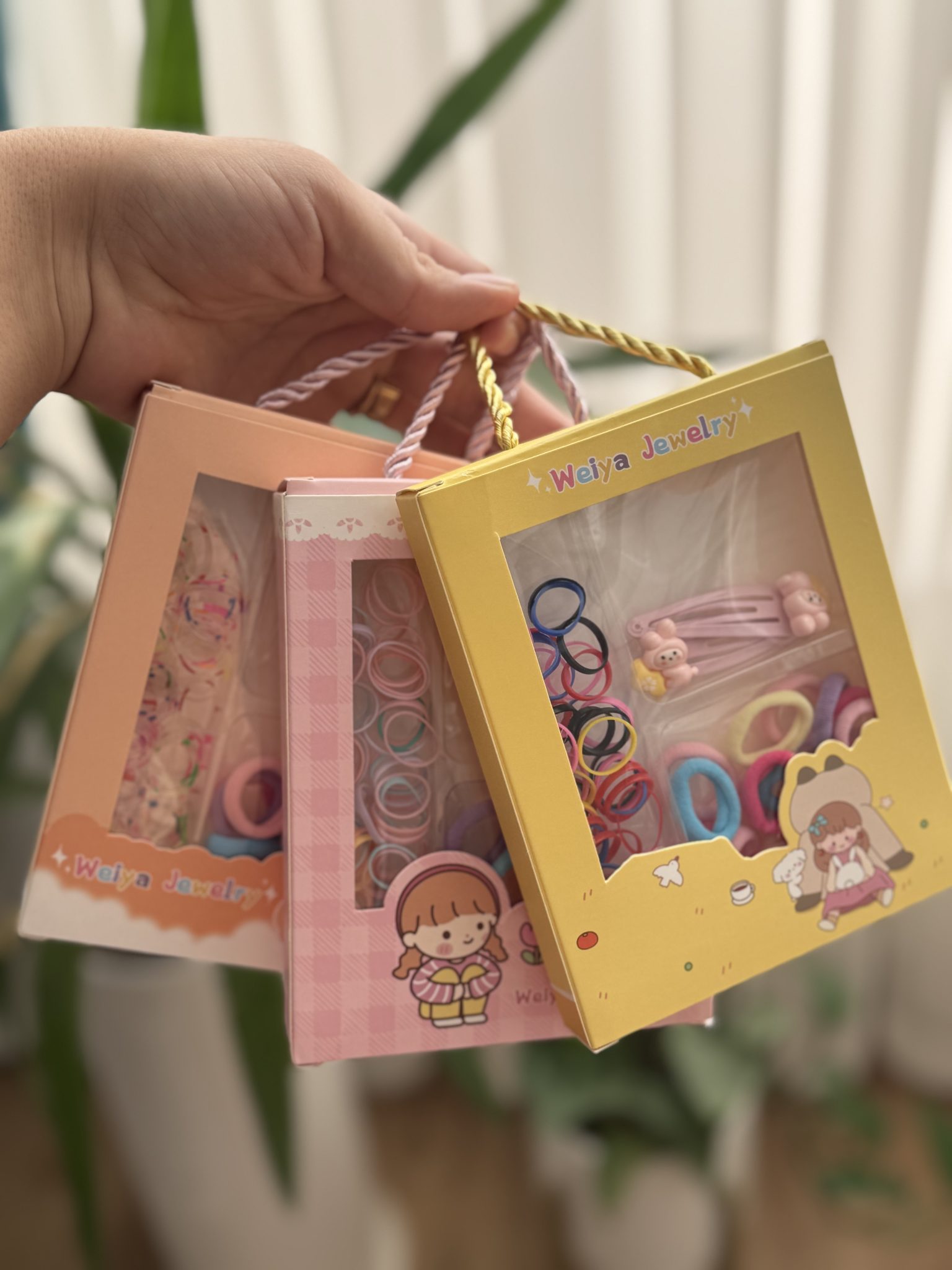 جعبه فانتزی شامل ۲ عدد گیره تق تقی عروسکی+۲۰عدد کش حوله ای سایز کوچیک+۵۰عددچل گیس
